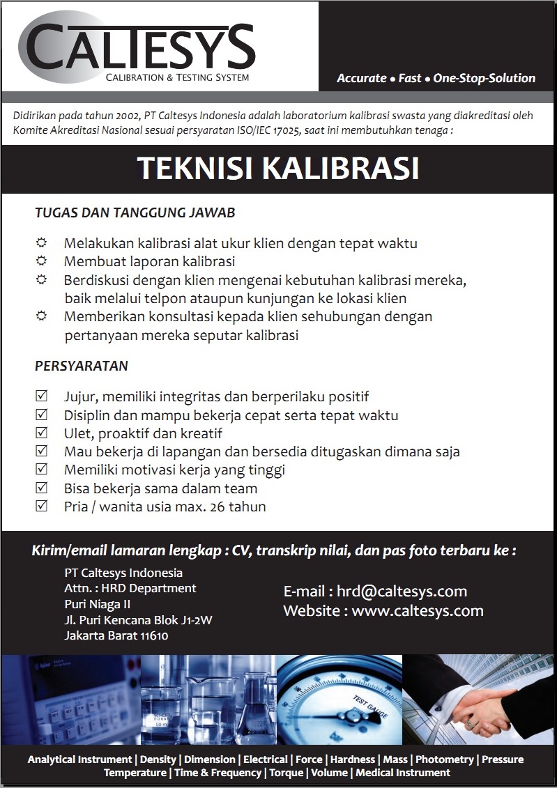 Lowongan Kerja Teknisi Kalibrasi di PT.Caltesys, untuk persyaratan dan cara melamar silahkan baca pada poster di bawah ini