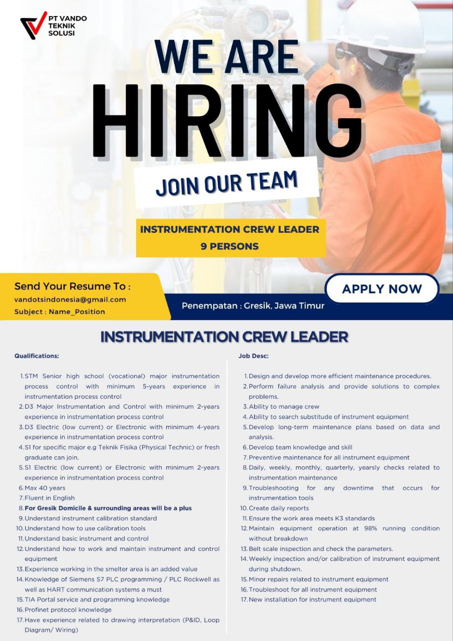 | Deskripsi | **PT. VANDO TEKNIK SOLUSI** membuka lowongan utk 3 posisi tercantum dlm jumlah banyak, penempatan**GRESIK, JAWA TIMUR** silakan bagi yg berminat apply via email tertera di poster dan isi link berikut : |