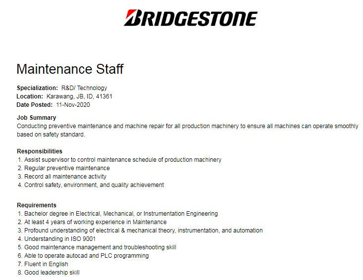 | Nama Berita | Lowongan Posisi Maintenance Staff di Bridgestone |