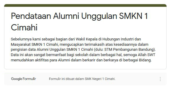 Bapak/Ibu/Saudara/Saudari Alumni SMK Negeri 1 Cimahi dapat mengisi Formulir Penelusuran Alumni Unggulan dengan cara membuka halaman berikut ini : Form Penelusuran Alumni Unggulan (Sukses)