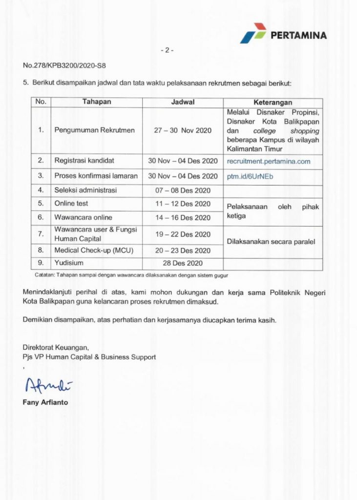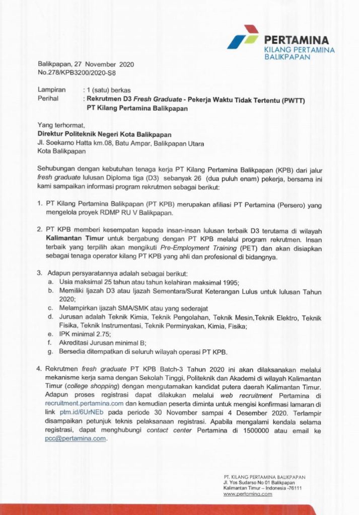 | Nama Berita | Rekrutmen D3 Fresh Graduate - Pekerja Waktu Tidak Tentu di Pertamina Balikpapan |