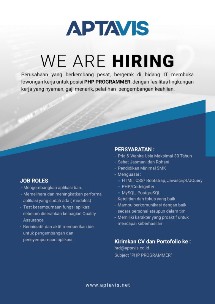 Lowongan diterima oleh tim Career Center pada 12 Desember 2020. Silahkan untuk alumni yang berminat untuk posisi PHP Programmer, dapat langsung menghubungi kontak.