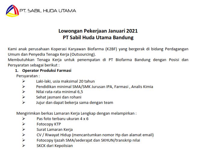 Silahkan mengunduh file pengumuman lowongan berikut (format file pdf) berikut untuk melihat detail mengenai lowongan: Pengumuman Lowongan Pekerjaan di PT Sabil Huda Utama Bandung (Januari 2021). |