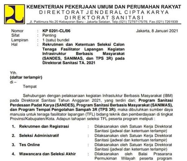 | Deskripsi | Lowongan diterima oleh tim Career Center pada 14 Januari 2021. Silahkan untuk alumni yang berminat untuk posisi di PUPR, dapat langsung menghubungi kontak.