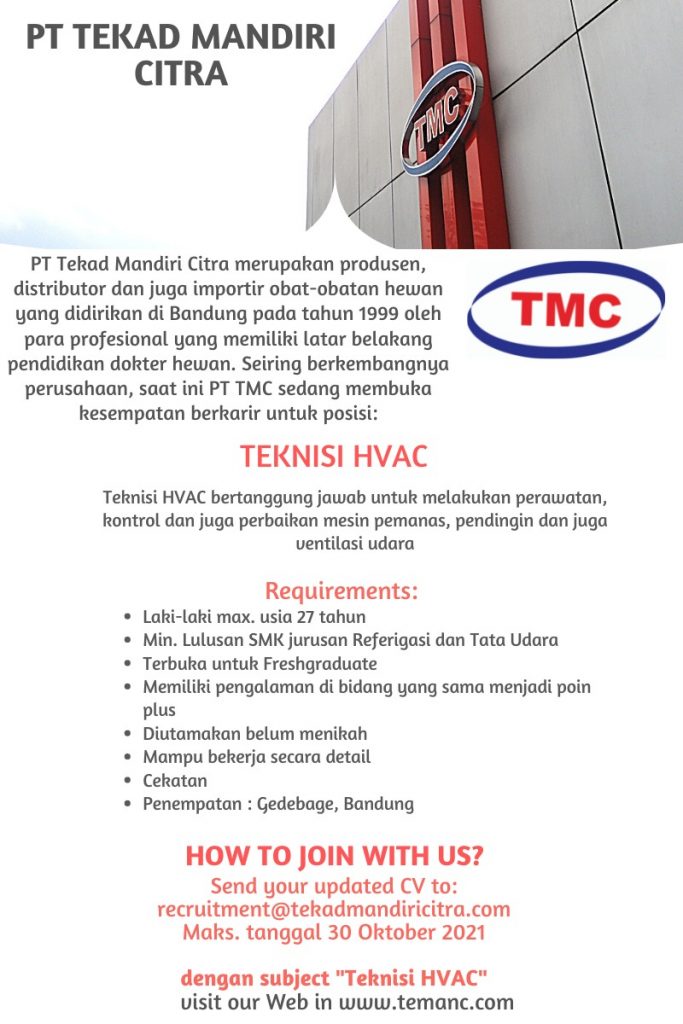 Lowongan Kerja Teknisi HVAC, yang berminat silahkan mendaftarkan diri, apabila sudah bekerja segera dilaporkan ke hubin