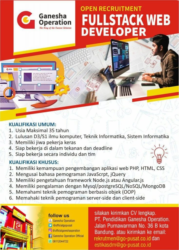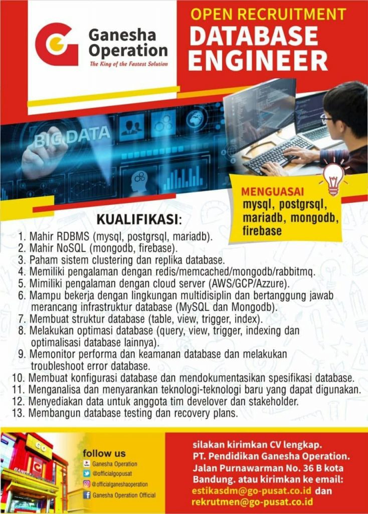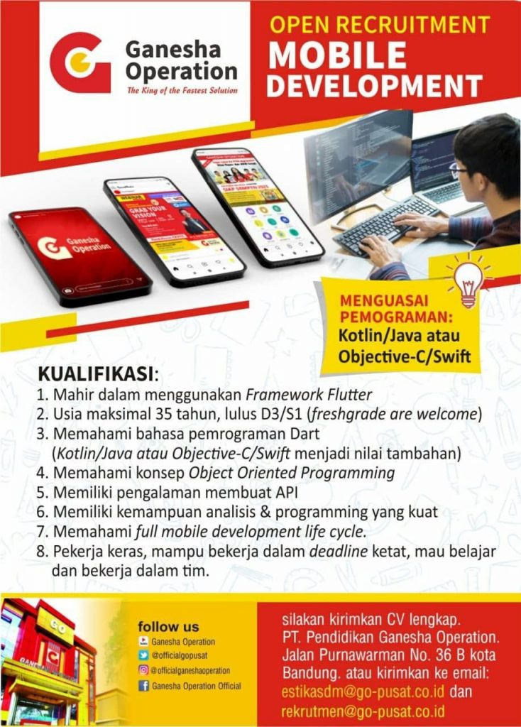 Persyaratan"Mobile Developer" a. Minimal lulusan D3/S1 jurusan Sistem Informasi, Teknik Informatika, Ilmu Komputer, atau sejenisnya. b. Memiliki pengalaman minimal 1 tahun (freshgraduate are welcome) c. Mahir dalam menggunakan Framework Flutter. d. Memahami bahasa pemrograman Dart (Kotlin/Java atau Objective-C/Swift menjadi nilai tambah). e. Memahami konsep Object Oriented Programming. f. Memiliki pengalaman membuat APL g. Memahami full mobile development life cycle. "Database Engineer" a. Mahir RDMS (mysql, postgrsql, mariadb) b. Mahir NoSQL (mongodb, firebase) c. Paham sistem clustering dan replikasi database d. Memiliki pengalaman dengan redis/memcached/mongodb,rabbitmq e. Memiliki pengalaman dengan cloud server (AWS/GCP/Azzure) "Fullstack Web Developer" a. Memiliki kemampuan pengembangan aplikasi web PHP, HTML, CSS b. Menguasai bahasa pemograman Javascript, jQuery c.Memiliki pengetahuan framework Node.jd atau Angular.jd d. Memiliki pengalaman degan Mysqlm PostgreSQL, MongoDB e.Memahami teknik pemograman berbasis objek (OOP) f. memahami teknik pemograman server-side dan client-side.Email : rekrutmen@go-pusat.co.id Web : https://ganeshaoperation.com Lokasi Penempatan: Kota Bandung ![]() |