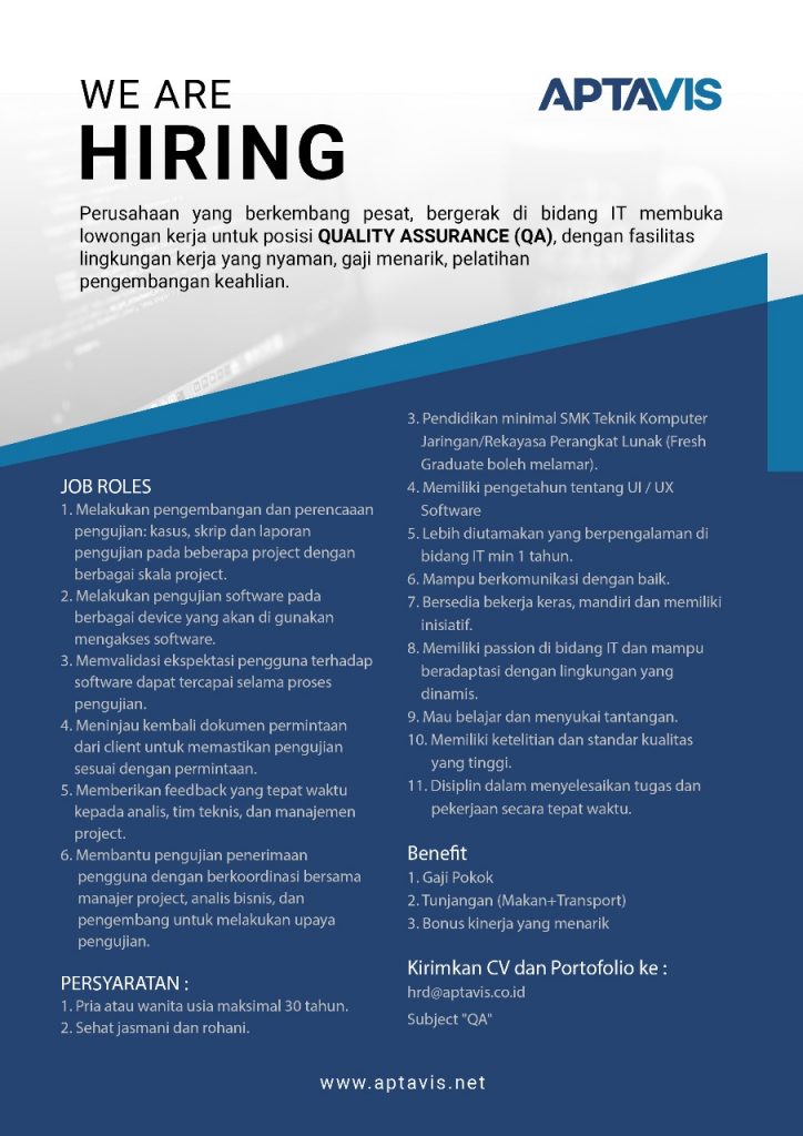 | Nama Berita | Lowongan APTAVIS untuk Posisi Quality Assurance |