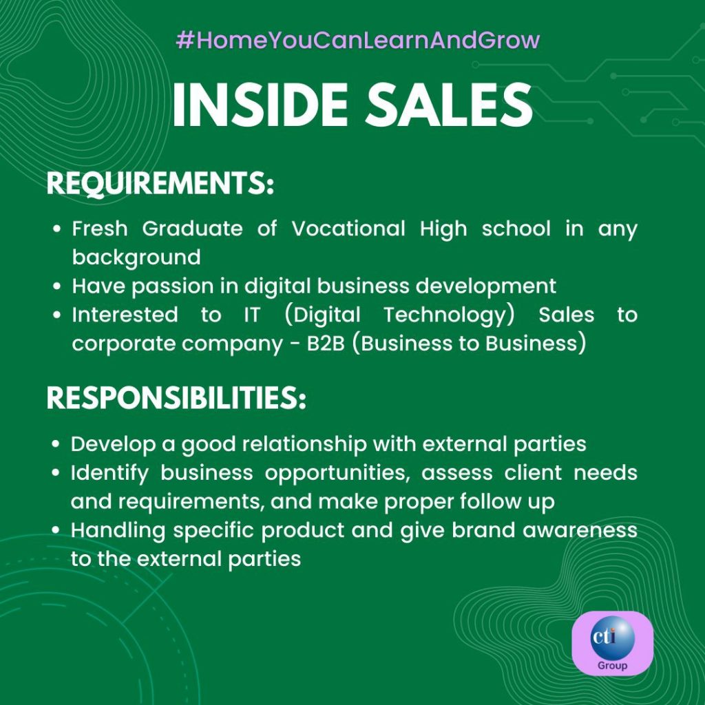 PT. Computrade Techology International (CTI Group) is hiring for Inside Sales with job requirements: